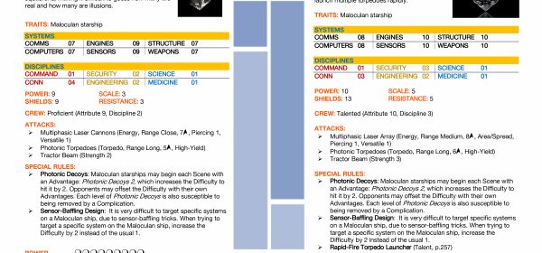 Here are two starships used by the Maloculans (see their species profile and NPCs articles from previous weeks). Maloculan starships are able to create photonic decoys, and have sensor-baffling designs that make specific systems difficult to target. Their multiphasic phasers are versatile, and due to their multiphasic enhancement, can penetrate shields. Their torpedoes are less advanced, and are photonic torpedoes.