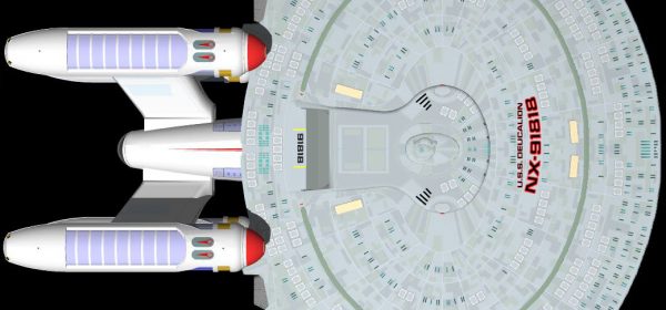 Here are some 3D images of what the U.S.S. Deucalion would look like. It’s a mash-up of the beautifully detailed SketchUp models designed by T.E. Williams, specifically his U.S.S. Atlantic saucer, his Enterprise-C model, and the pylons were scaled modifications of his Olympic-class model.