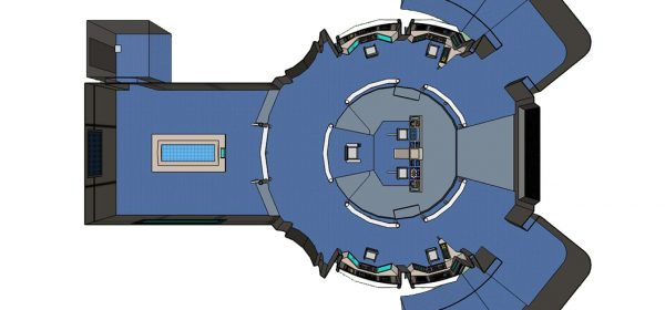 Continuing our series on 3D bridges as battle-grids, here’s the bridge of the Sovereign Class starship. There are some great fan-designed 3D models, many very faithful to the original blueprints, that a snapshot could work quite well for a tabletop battle-grid. Credit always goes to the 3D modeler. I only add missing bits and a bit of colour. Search here for the full series.