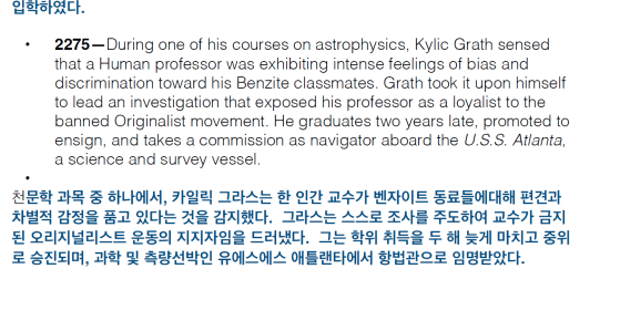 An inspiring example of embracing inclusivity is demonstrated by one of our players. With Korean as her native language, she took it upon herself to convert our game bible into Korean, ensuring that she fully understood the plot points and details of the game. [See sample below.] This act of dedication not only allowed her to actively engage in the storyline but also showcased her commitment to bridging language gaps and embracing the game in her own unique way.